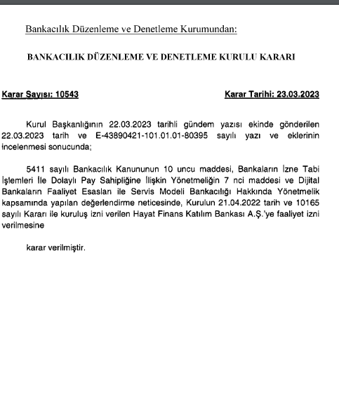Ayrıca, Hatay Finans Katılım Bankası’na da faaliyet izni verildi.
